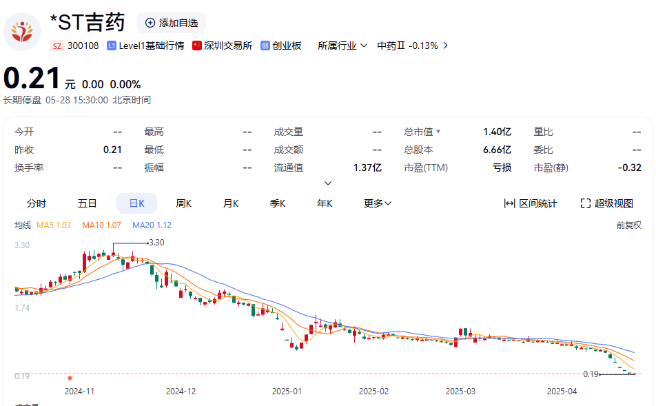 行情方面,*ST吉药已于4月24日停牌,停牌前,该公司股价报0.21元/股。
