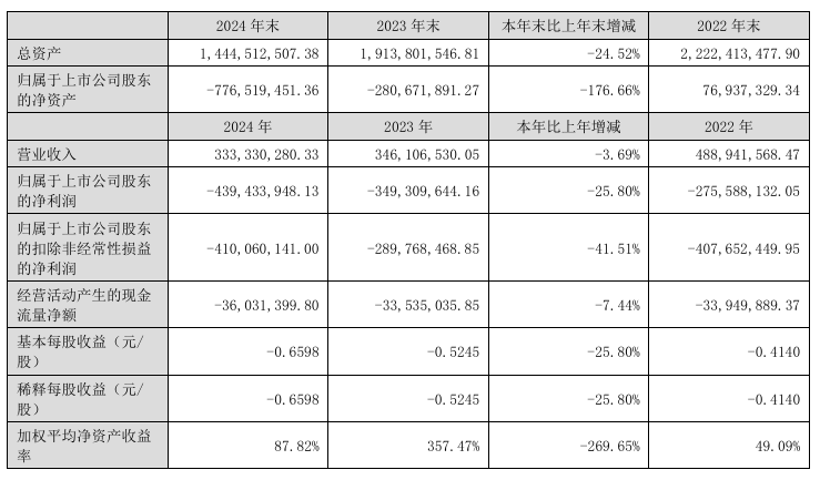 从公司披露的财务数据来看,公司2024年年报显示,报告期内,公司实现营收3.33亿元,同比下降3.69%;净利润亏损4.39亿元,上年同期亏损3.49亿元。
