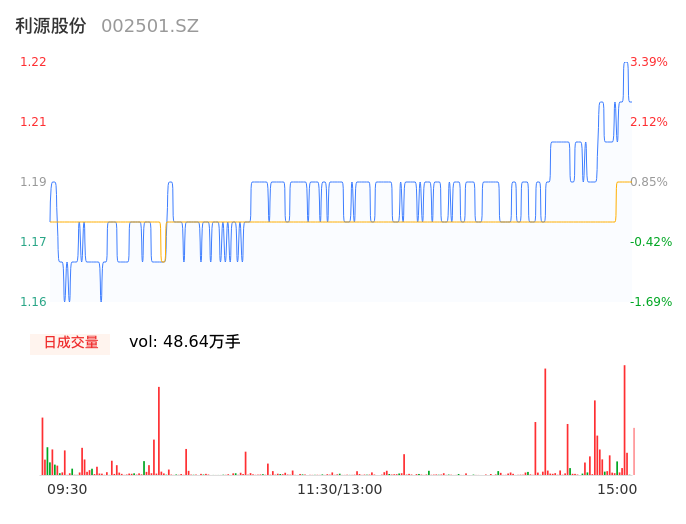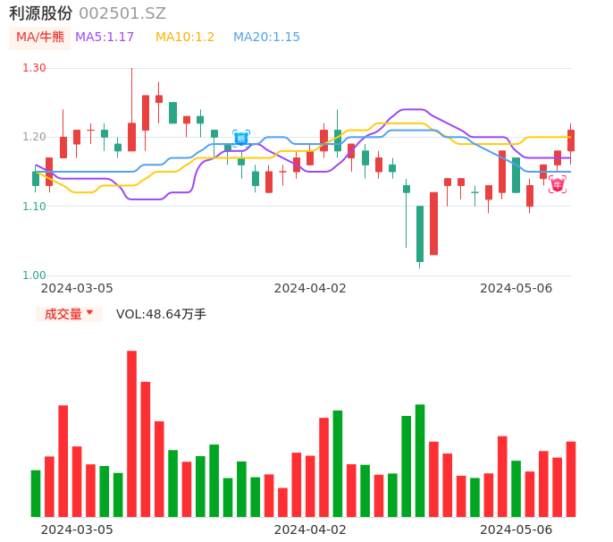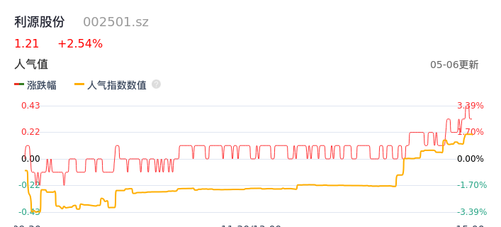 05月06日,利源股份收报1.21,股价涨幅2.54%,成交金额5779.35万元,换手率1.37%。
