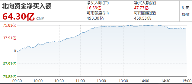 今天,A股三大指数都有不小的涨幅,上证上涨1.7%,创业板指则暴力拉升3.5%,分时图上来看,白线明显跑赢黄线,权重板块经过这么长时间的压抑,今日终于迎来超跌反弹,这是好迹象。资金层面上,今日北向资金净买入64.30亿元。
