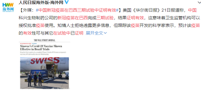 美国《华尔街日报》21日报道称,中国科兴生物制药公司的新冠疫苗在巴西完成三期试验,结果证明有效,这意味着卫生监管机构可以授权批准疫苗使用。