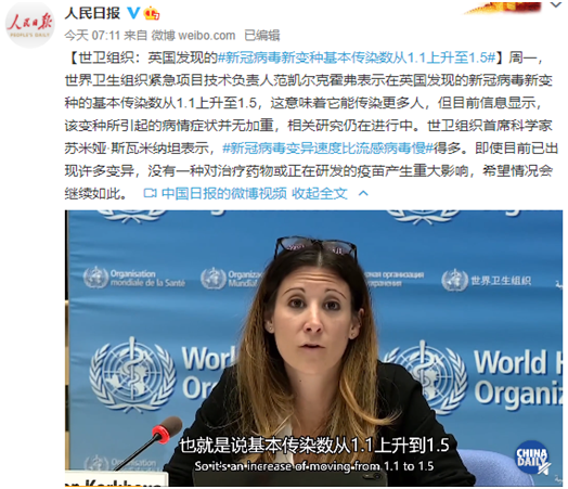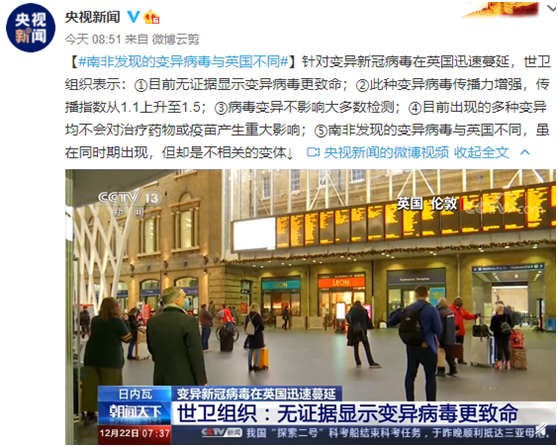 针对变异新冠病毒在英国迅速蔓延,世卫组织表示:①目前无证据显示变异病毒更致命;②此种变异病毒传播力增强,传播指数从1.1上升至1.5;③病毒变异不影响大多数检测;④目前出现的多种变异均不会对治疗药物或疫苗产生重大影响;⑤南非发现的变异病毒与英国不同,虽在同时期出现,但却是不相关的变体。