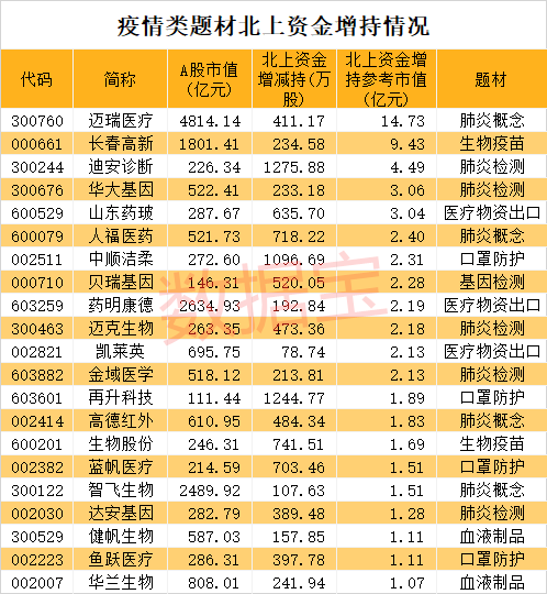 各路资金对疫情类题材的关注度逐渐升温。按照成交均价粗略计算,12月以来疫情类题材股合计获得北上资金增持55.5亿元。21股获得北上资金增持超亿元,分别包括迈瑞医疗、长春高新、迪安诊断、华大基因、人福医药、迈克生物等。迈瑞医疗获增持金额最高,达到14.7亿元,该股月内涨幅超15%,目前市值为4780亿。