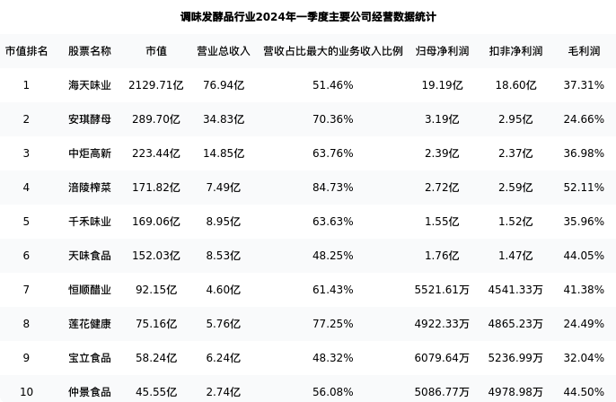 涪陵榨菜最新报告期数据为一季度,下表汇总了调味发酵品行业内市值靠前的公司一季度主要经营数据