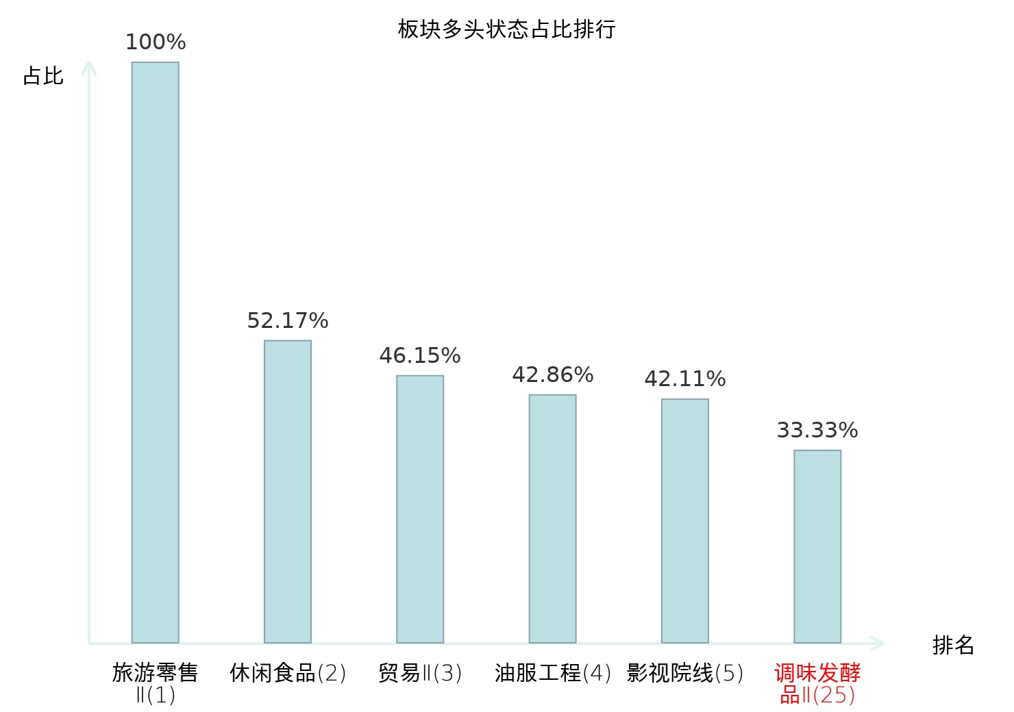 全市场所有行业板块中主力多头状态占比排名中,旅游零售Ⅱ板块位居第一。体育Ⅱ板块名次提升最快,较昨日上升99位。