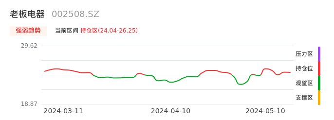 我们来看一下该股的九方特色指标强弱趋势的情况:老板电器自05月06日从观望区上穿到持仓区。股价近期在多头区域持续强势上扬,上升动能仍较为充足,可积极关注。后续重点关注上方压力位:26.25元是否能突破上攻。