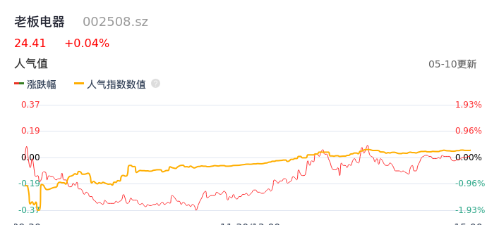 05月10日,老板电器收报24.41,股价涨幅0.04%,成交金额2.44亿元,换手率1.08%。