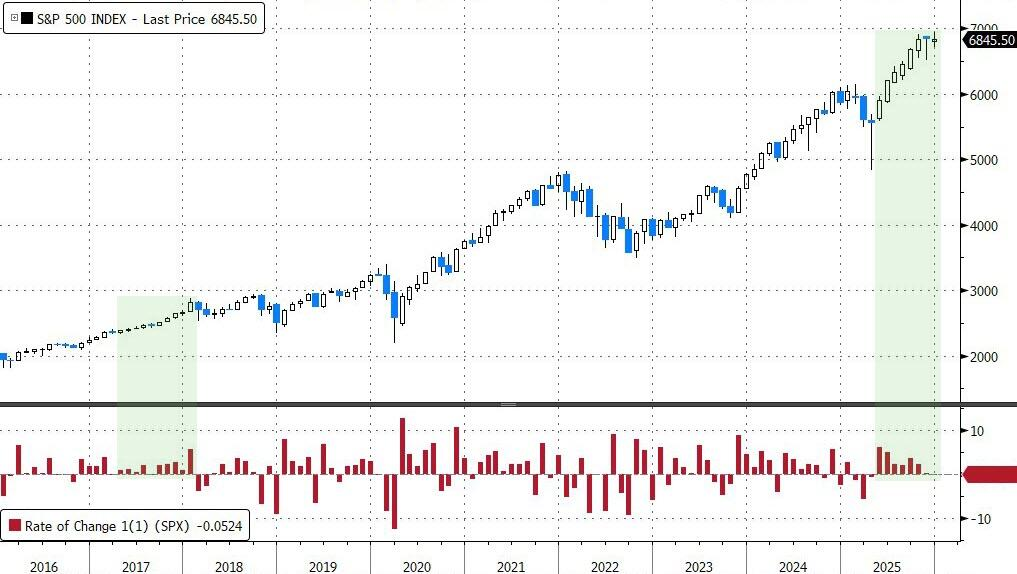 纳斯达克100指数(NDX)全年大涨21%,标普500指数录得18%的总回报(含股息),道琼斯指数与罗素2000指数分别上涨15%和13%。标普500甚至以一波罕见的“8个月连涨”收官,这是自2017年以来未曾有过的强势表现。