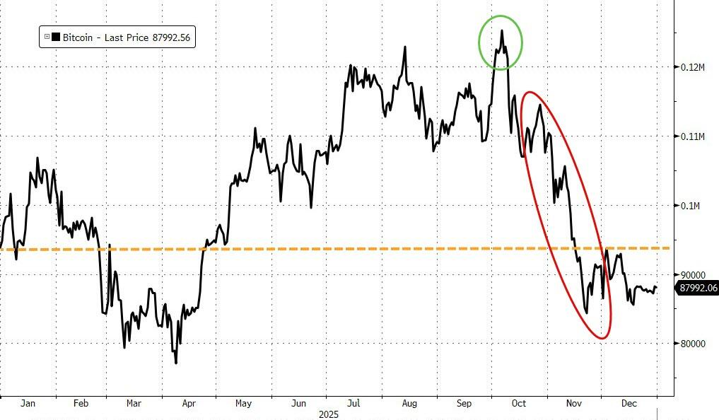 他认为,与黄金受到央行等结构性买家支撑不同,比特币在2025年遭遇了显著的获利了结与清算。