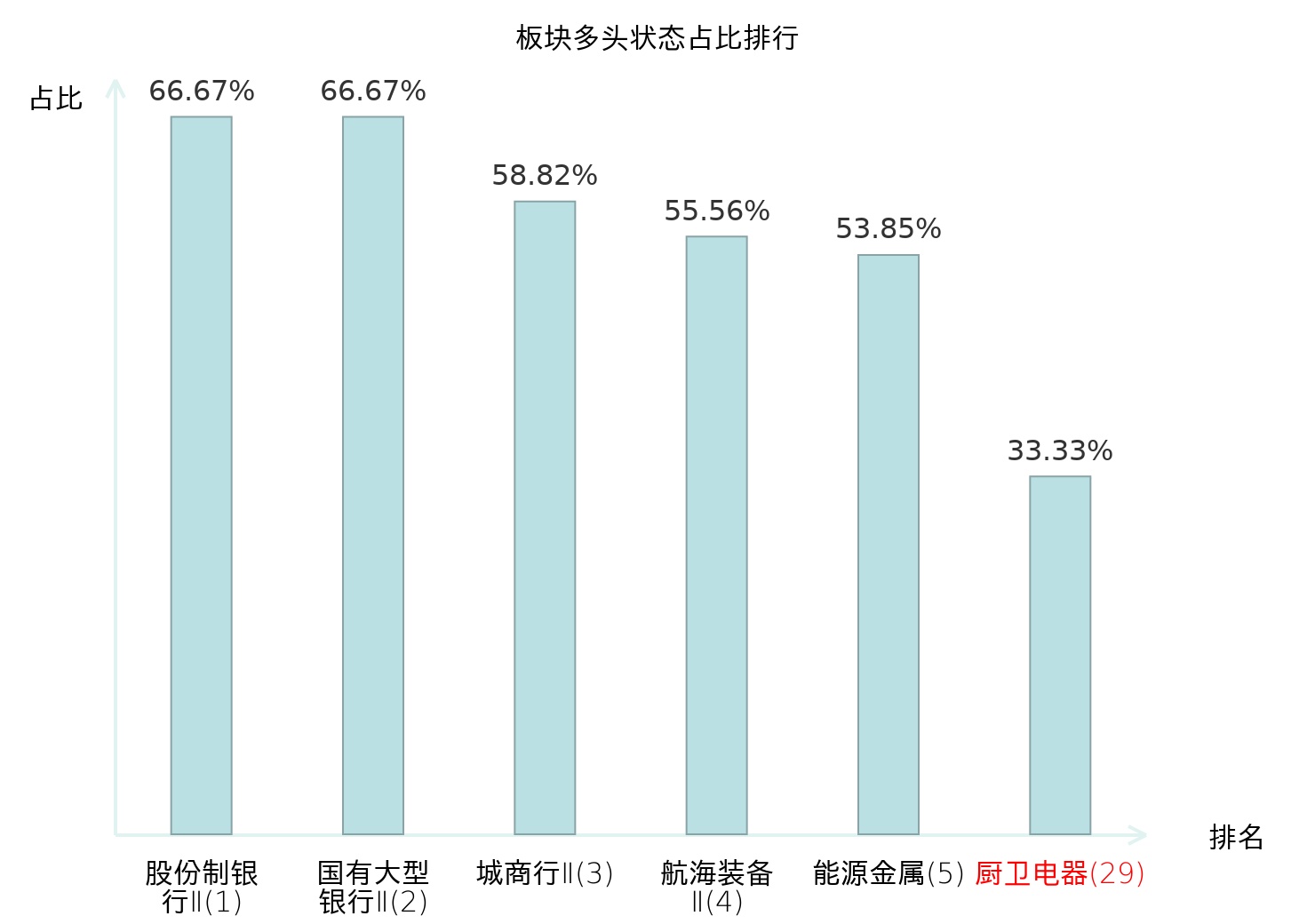 全市场所有行业板块中主力多头状态占比排名中,股份制银行Ⅱ板块位居第一。渔业板块名次提升最快,较昨日上升61位。