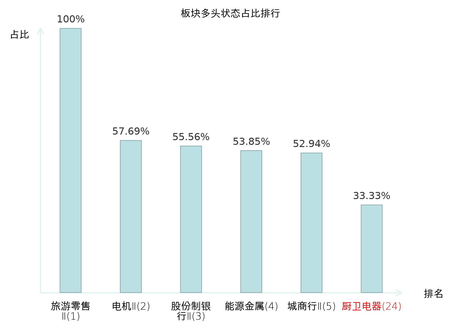 全市场所有行业板块中主力多头状态占比排名中,旅游零售Ⅱ板块位居第一。地面兵装Ⅱ板块名次提升最快,较昨日上升99位。