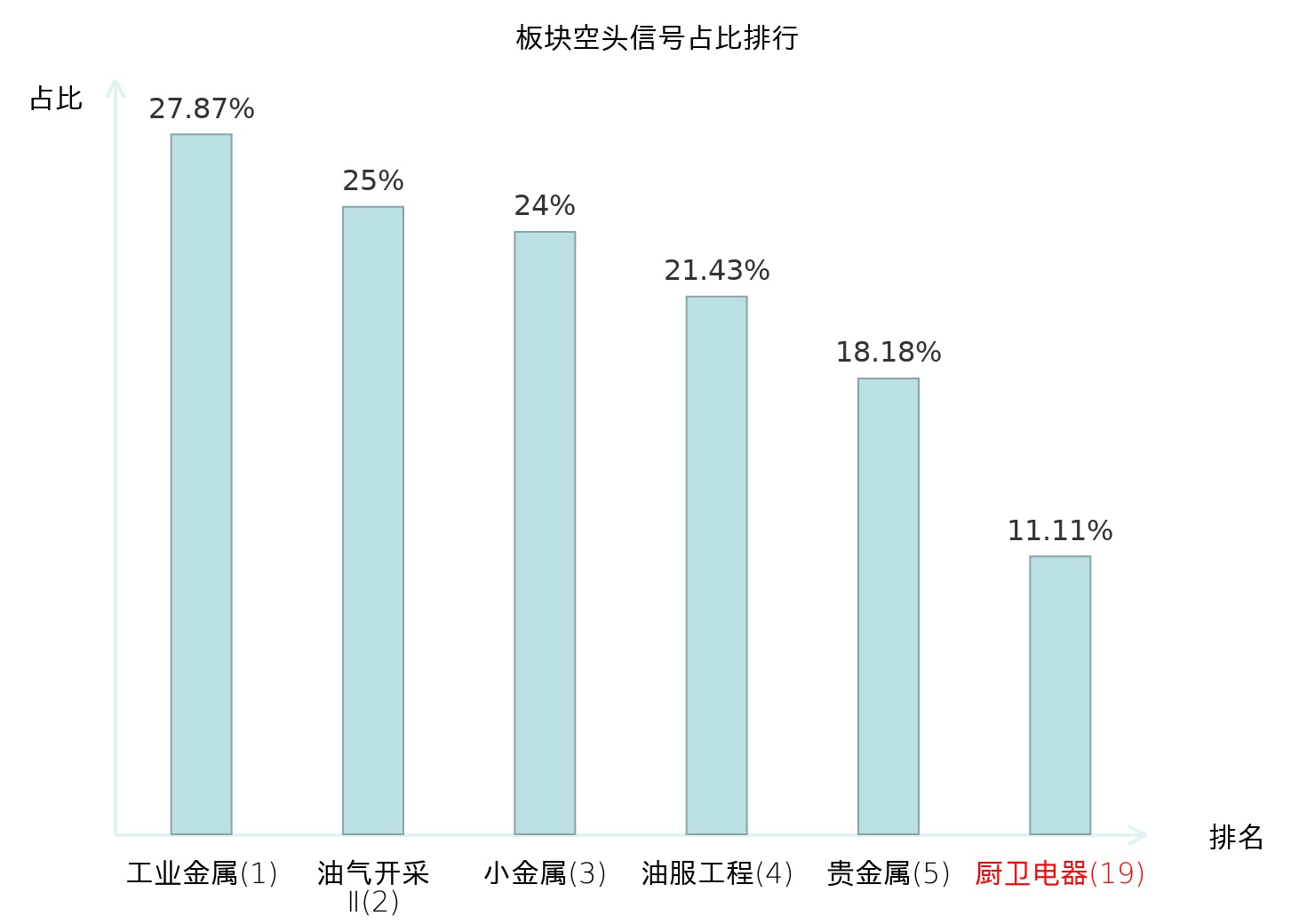 全市场所有行业板块中主力空头信号占比排名中,工业金属板块位居第一。饲料板块名次提升最快,较昨日上升112位。