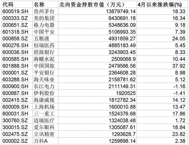 统计显示,北向资金最新前20大重仓股,4月以来平均涨幅高达12.06%,显著跑赢同期上证指数,其中有中国国旅、五粮液、立讯精密等区间涨幅均超过20%。