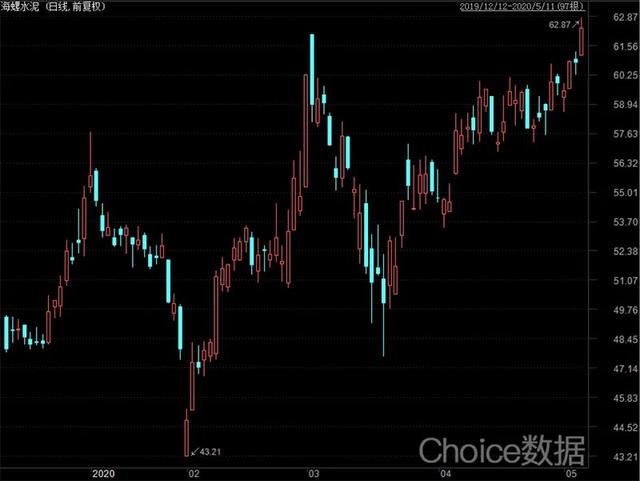 海螺水泥今日早盘最高触及62.87元(前复权价格,下同),超越3月初高点再创历史新高,今年以来累计涨幅达到13.91%。
