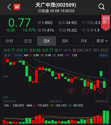 5月8日,天广中茂股价跌停,收报0.77元。全天成交238万手,换手率达11.41%,成交额达1.85亿元。