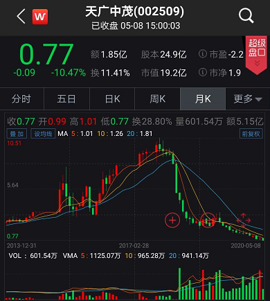 自2020年4月9日至5月8日,公司股票已连续19个交易日收盘价格均低于股票面值(1元人民币),即使下个交易日股价涨停,仍然不能站上1元。这意味着,天广中茂已锁定一个退市名额。