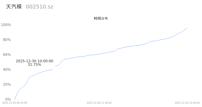 002510天汽模2025年12月30日成交69.65万手,成交金额5.17亿,相较昨日缩量39.45万手,换手率6.93%,成交清淡。