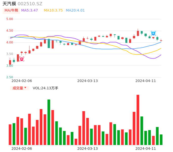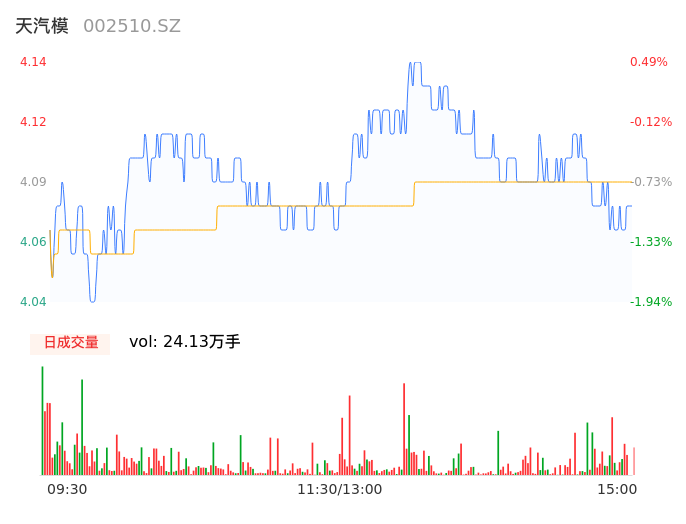 04月11日,天汽模收报4.08,股价涨幅-0.97%,成交金额9866.31万元,换手率2.59%。