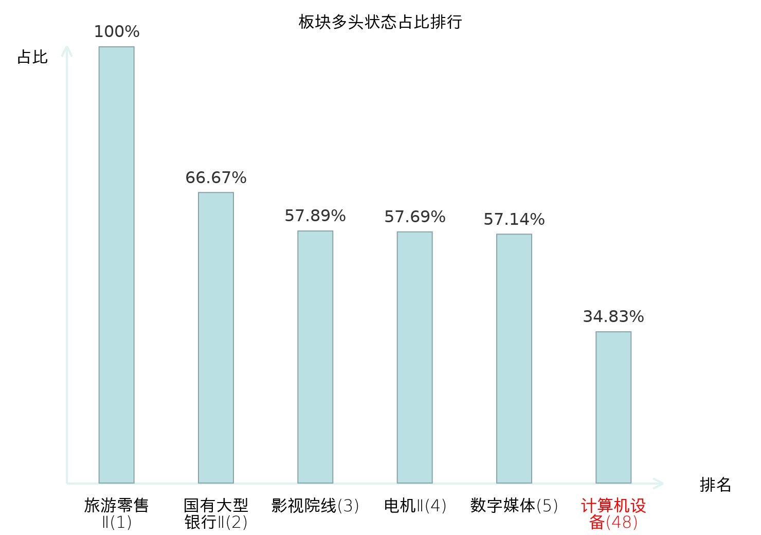 全市场所有行业板块中主力多头状态占比排名中,旅游零售Ⅱ板块位居第一。专业连锁Ⅱ板块名次提升最快,较昨日上升56位。