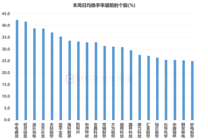 若以换手率数据统计,不计算近1个月上市的新股,累计共有13股本周日均换手率在30%以上。其中,计算机股中电鑫龙、初灵信息日均换手率分别达42.44%、41.68%,波长光电、北方长龙、天际股份、蓝丰生化、海科新源等股也在本周交投活跃。同样以行业板块统计,这13只个股中,电力设备、电子、机械设备、计算机、有色金属股数量相对较多。