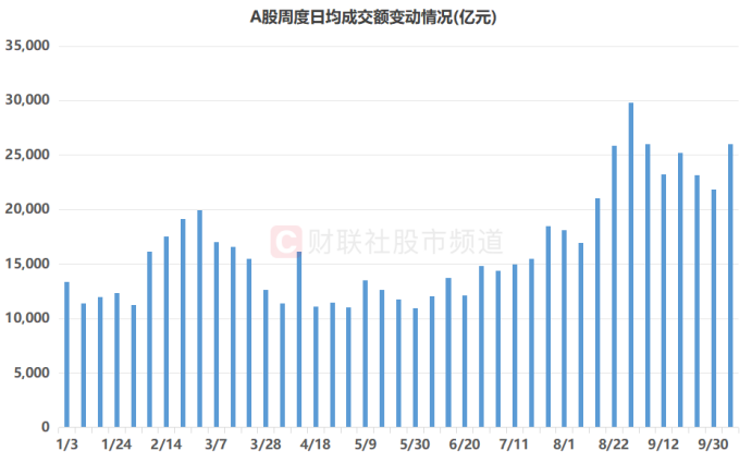 节后首周(10月9日至10日),A股市场交投数据较节前明显抬升,沪深京三市周内平均每日成交额达2.60万亿元,创9月5日(9月1日至5日当周)以来周度日均成交额新高。从年内行情上看,其日均成交额规模位居次高纪录,仅低于8月25日至29日当周数据。