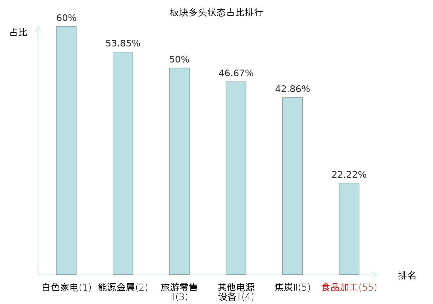 全市场所有行业板块中主力多头状态占比排名中,白色家电板块位居第一。油服工程板块名次提升最快,较昨日上升87位。