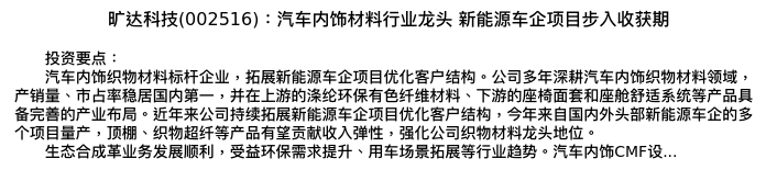 值得注意的是:2024年07月东海证券的黄涵虚分析师,首次发布关于旷达科技的研究报告,标题为:旷达科技(002516):汽车内饰材料行业龙头 新能源车企项目步入收获期。
