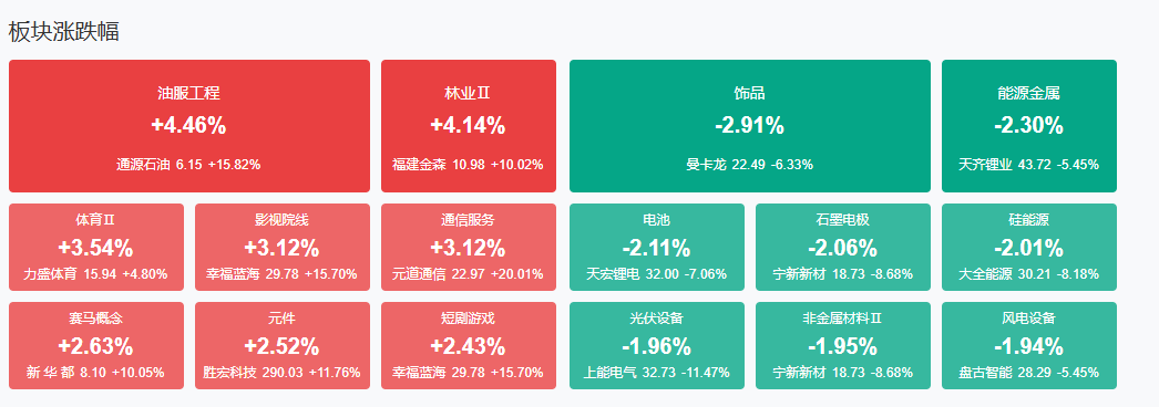 板块方面,油气、卫星互联网、影视院线、算力硬件等板块涨幅居前,电池、有色金属等板块跌幅居前。截至收盘,沪指涨0.17%,深成指涨0.24%,创业板指涨1.14%。