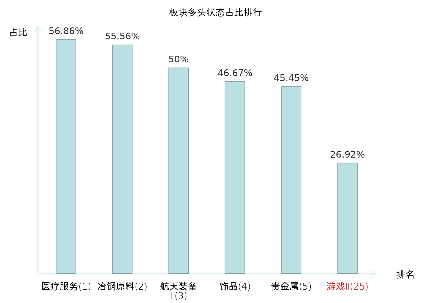 全市场所有行业板块中主力多头状态占比排名中,医疗服务板块位居第一。旅游及景区板块名次提升最快,较昨日上升61位。