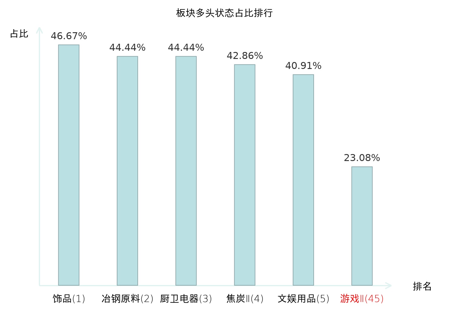 全市场所有行业板块中主力多头状态占比排名中,饰品板块位居第一。专业连锁Ⅱ板块名次提升最快,较昨日上升68位。