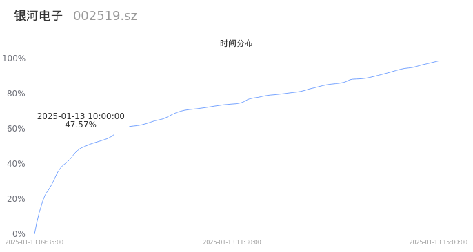 002519银河电子2025年01月13日成交28.29万手,成交金额1.58亿,相较昨日缩量7.62万手,换手率2.53%,成交清淡。