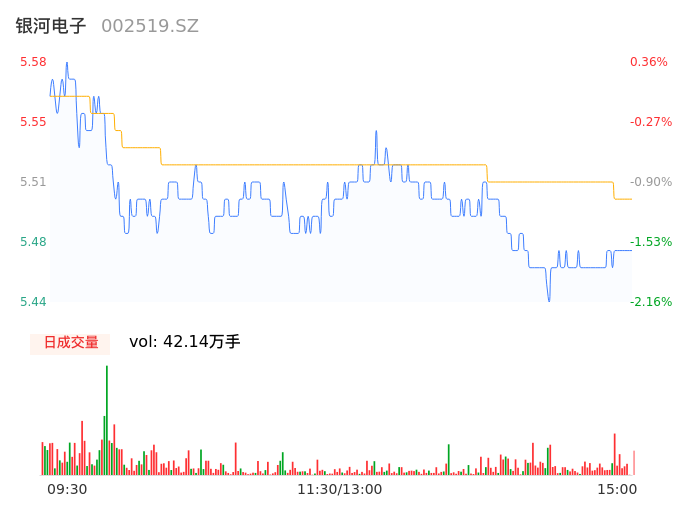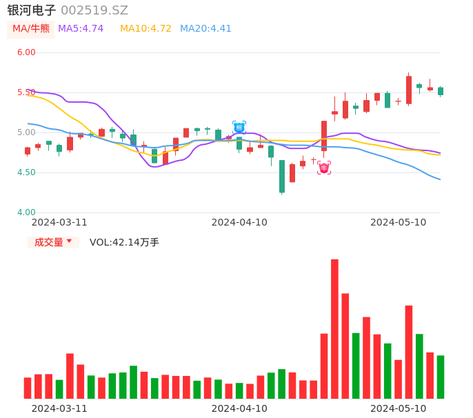 05月10日,银河电子收报5.47,股价涨幅-1.62%,成交金额2.32亿元,换手率3.78%。