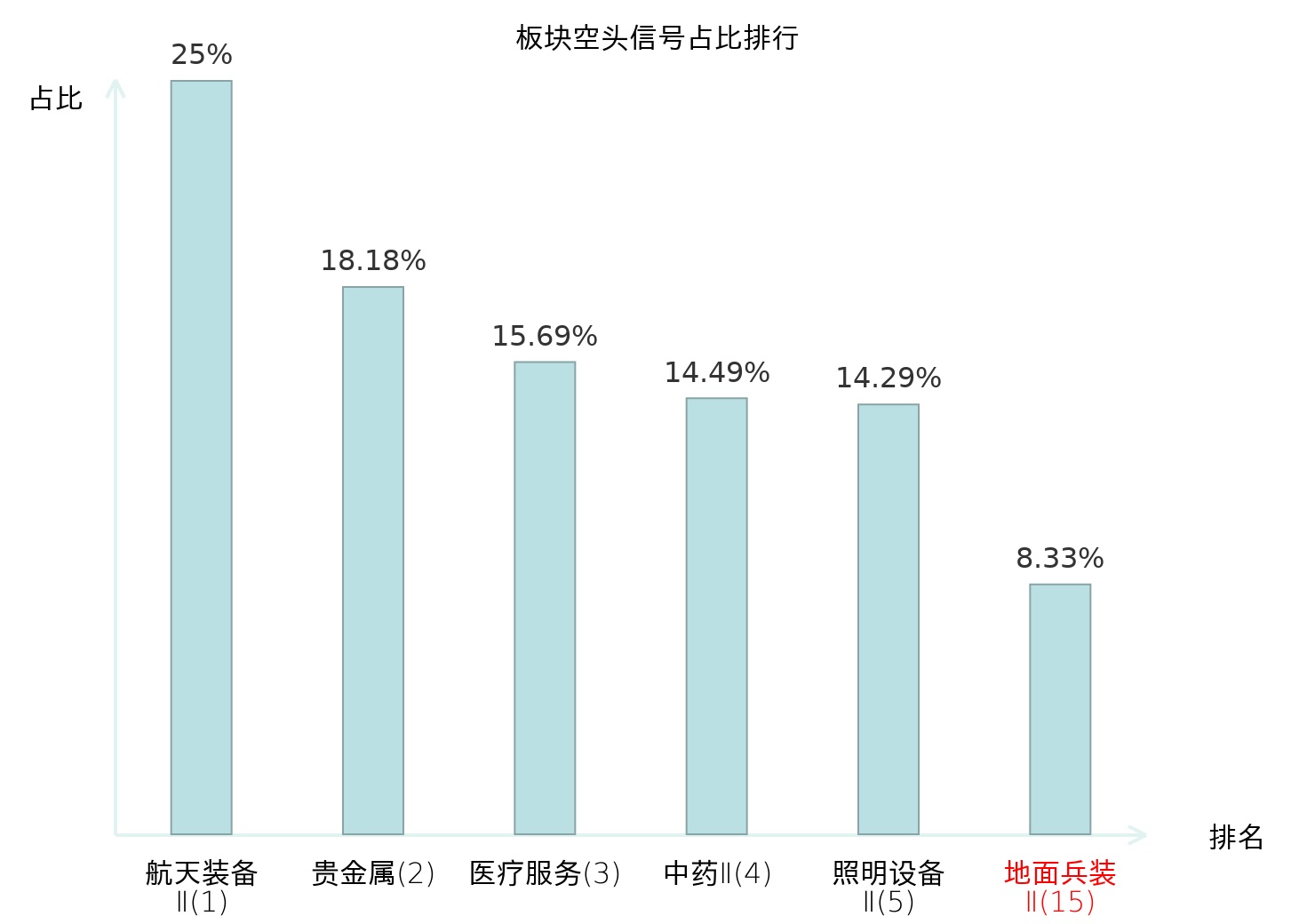 全市场所有行业板块中主力空头信号占比排名中,航天装备Ⅱ板块位居第一。物流板块名次提升最快,较昨日上升112位。