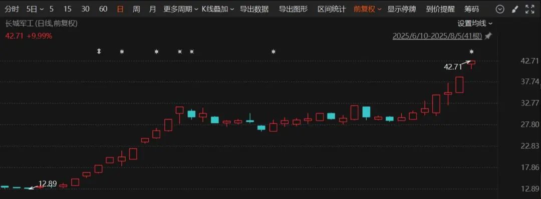 军工股继续走强,地面兵装方面领涨,板块指数盘中一度放量涨近5%,创2015年7月以来10年新高,半日成交超昨日全天成交。长城军工高开后快速涨停,近4个交易日三度涨停,今年以来累计大涨逾263%,北方长龙、银河电子等涨幅居前。