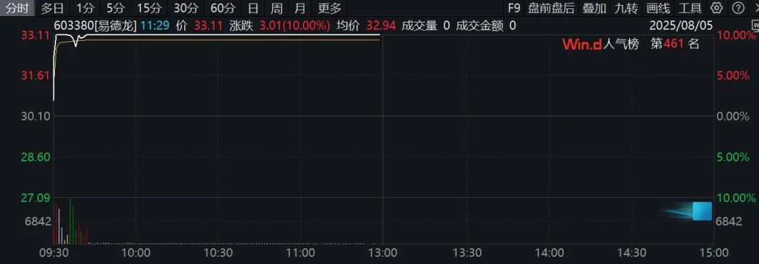 消费电子板块也强势上攻,板块指数高开高走一度放量涨逾2%,福日电子高开后秒速涨停,连续第2日封板,易德龙也在开盘后仅约1分钟时间就垂直涨停。
