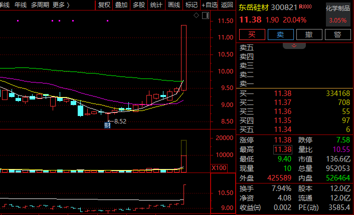 有机硅概念近来连续走强,今日早间,板块指数再度放量大涨逾4%,创3年多来新高,半日成交超昨日全天成交。东岳硅材直线20%涨停,江苏国泰合盛硅业等也快速封板。