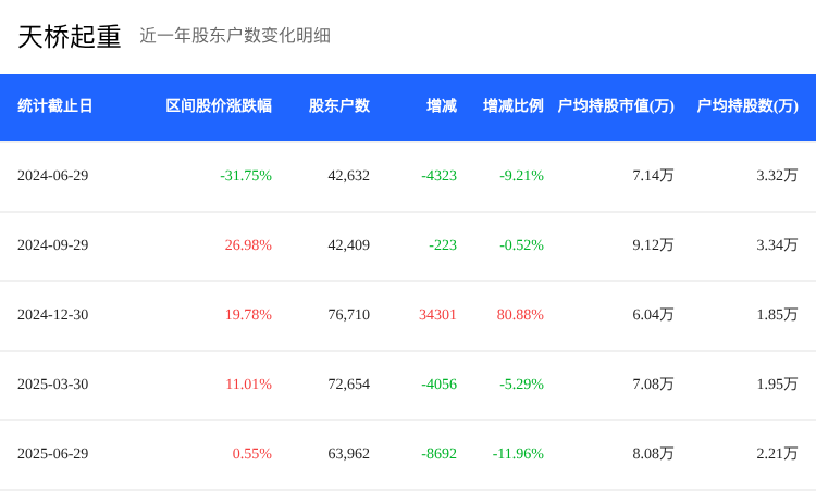 天桥起重(002523)在2025年第二季度的股东户数为6.40万,较上一季度减少了11.96%,户均持股数量上升至13.59万股,户均持股市值为8.08万元,环比增长14.22%。这表明股东集中度有所提高,单个股东持有更多数量的股票,可能是由于部分小股东退出市场,或是大股东增持所致。