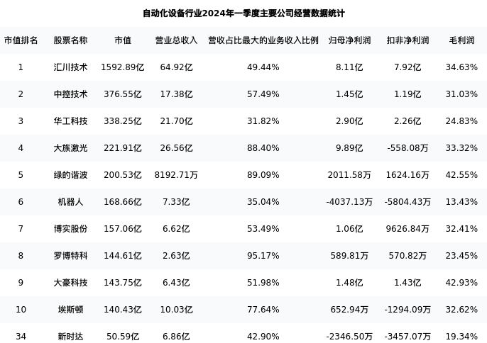 新时达最新报告期数据为一季度,下表汇总了自动化设备行业内市值靠前的公司一季度主要经营数据