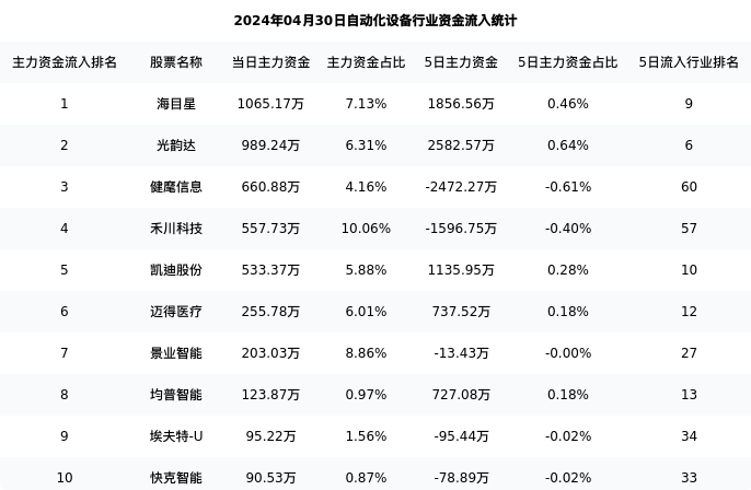 从主力资金流向来看,自动化设备行业今日主力资金流入38.77亿元,在所有申万二级行业中排名:80/131。