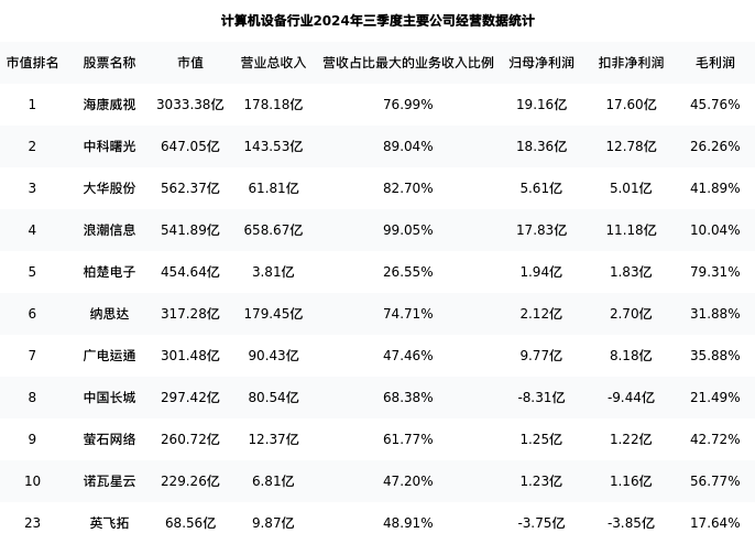 英飞拓最新报告期数据为三季度,下表汇总了计算机设备行业内市值靠前的公司三季度主要经营数据
