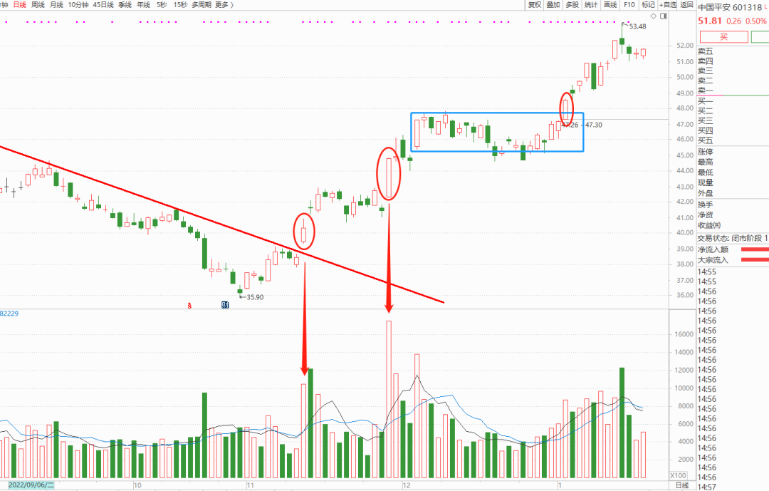 比如中国平安的走势,一买突破下降压力线,倍量确认后,股价上行;二买第一次突破箱体位置,同样需要倍量确认;三买处于行情加速阶段,主力已经深度持股,不再需要倍量柱确认身份,只需大阳线即可确认强度。