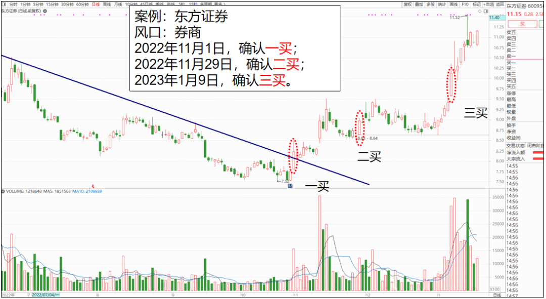 案例一:券商方向东方证券。该股在去年11月1日突破下降压力线,当天倍量柱确认主力买入信号,符合关键位置上的倍量柱特征,触发第一类买点;此后第一次进入箱体盘整区域,并在11月29日底部走出倍量上攻K线,触发第二类买点;今年1月9日,该股在突破箱体高点后,通过新的倍量柱结构,确认第三类买点。