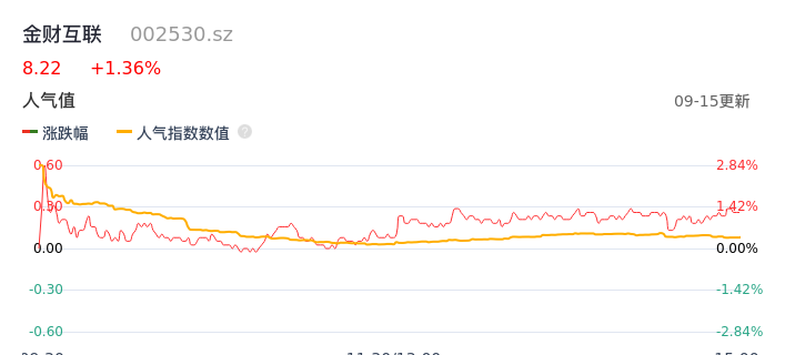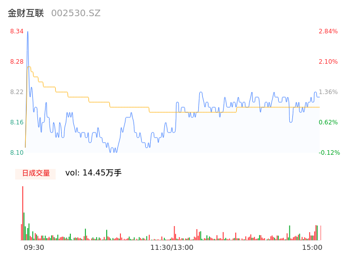 09月15日,金财互联收报8.22,股价涨幅1.36%,成交金额1.18亿元,换手率2.12%。