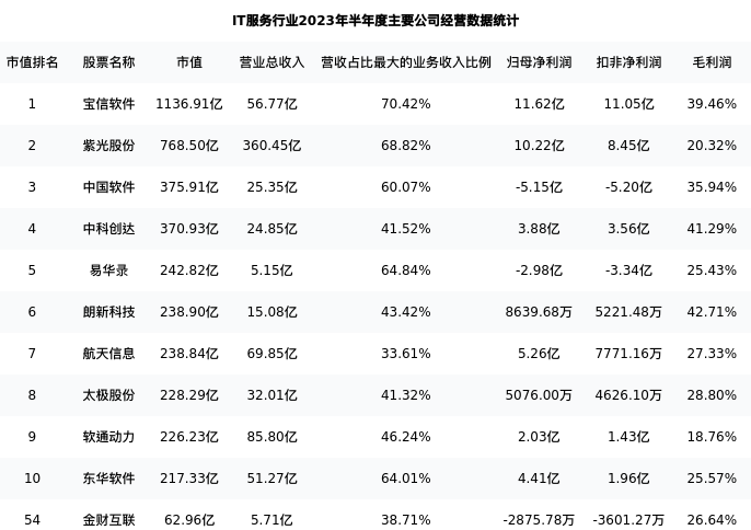 金财互联最新报告期数据为半年度,下表汇总了IT服务行业内市值靠前的公司半年度主要经营数据