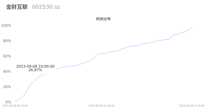 002530金财互联2023年09月08日成交13.46万手,成交金额1.03亿元,相较昨日缩量8.57万手,换手率1.98%,成交清淡。