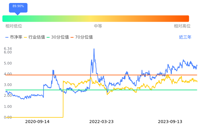 金财互联当前市净率PB为4.71,在所属的IT服务中,市净率PB排86,前五名分别为龙宇股份市净率0.93、城地香江市净率1.14、新智认知市净率1.24、东软集团市净率1.30、华宇软件市净率1.37。金财互联当前市净率PB为4.71,超过近3年89.90%的历史数据。