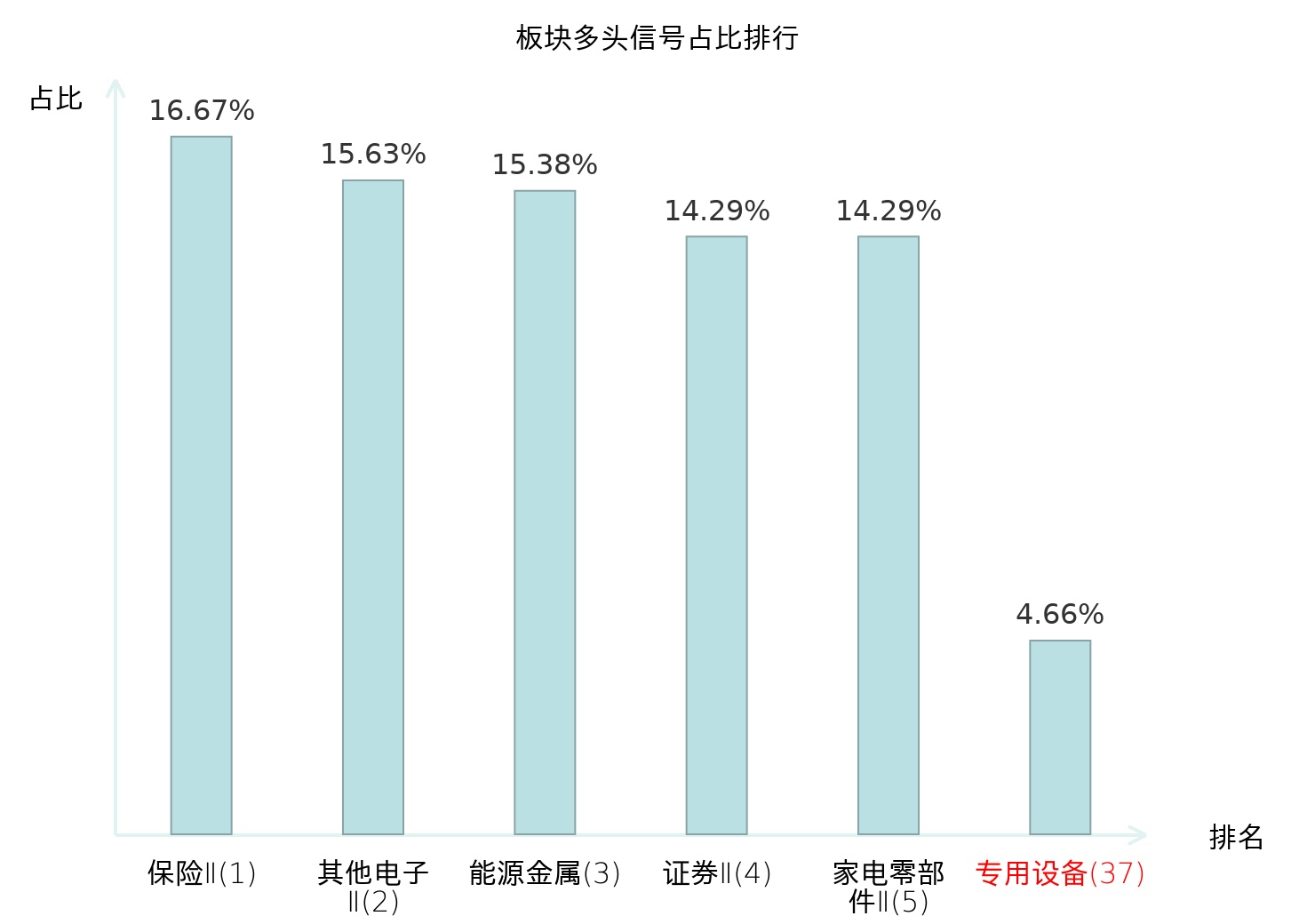从主力宝信号数据分析,金财互联所属的专用设备板块中,共有9只股票发出主力多头信号,主力多头信号占比在全行业中排名第37位,较昨日上升47位。排名的提升表明主力对于该板块的买入意愿增强。全市场所有行业板块中,主力多头信号占比排名中,保险Ⅱ板块位居第一。城商行Ⅱ板块名次提升最快,较昨日上升97位。这些变动揭示了不同行业间主力资金动向的趋势,为投资者提供了关于市场情绪和潜在投资机会的重要线索。