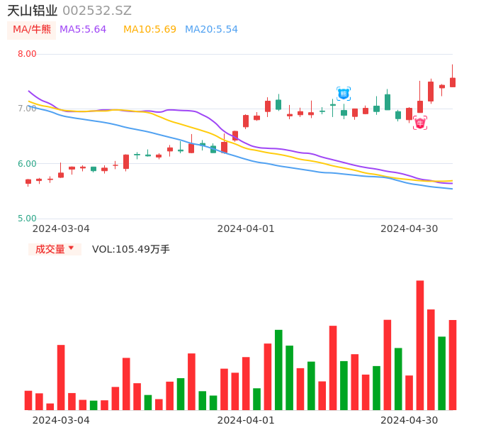 04月30日,天山铝业收报7.56,股价涨幅1.75%,成交金额8.05亿元,换手率2.55%。