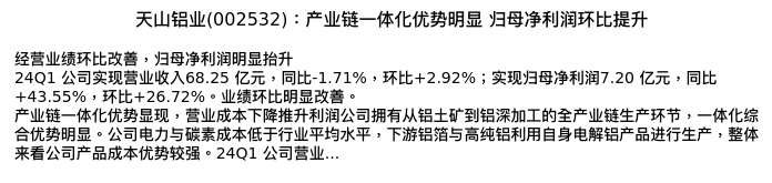 值得注意的是:2024年04月天风证券的刘奕町分析师,首次发布关于天山铝业的研究报告,标题为:天山铝业(002532):产业链一体化优势明显 归母净利润环比提升。