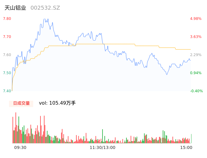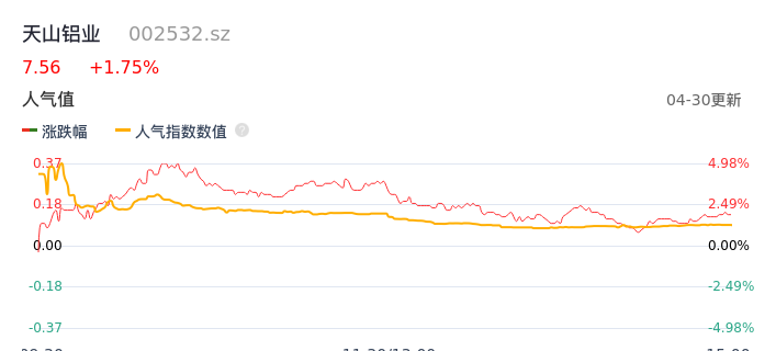 04月30日,天山铝业收报7.56,股价涨幅1.75%,成交金额8.05亿元,换手率2.55%。